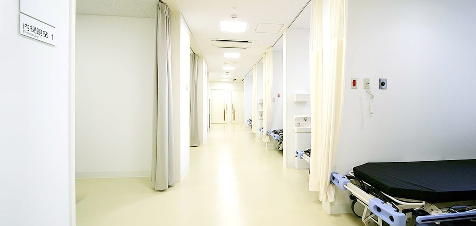また、検査終了後には検査ベッドのまま回復スペースに移動して、鎮痛剤・鎮静剤が切れるまで血圧などの全身状態をチェックしながら約1時間程度休んで頂いております。この回復スペースはカーテンで区切られ10台のベッドを並べることができますので、全例、意識下鎮静法で検査をすることも可能です。